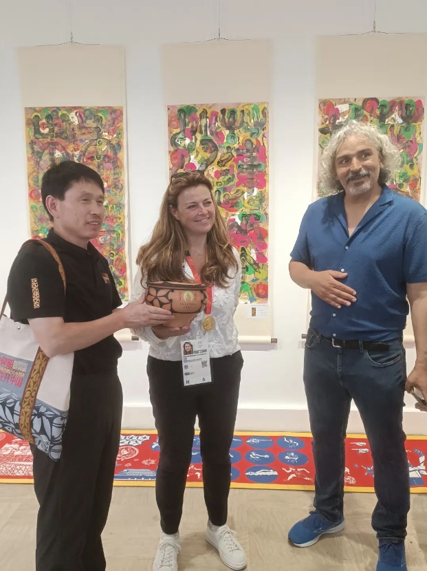 7月25日,在法國巴黎,來自三門峽市的王新軍(左)與現(xiàn)代奧林匹克運動會之父顧拜旦的曾孫女黛安·德·納瓦塞爾·德·顧拜旦夫人(中)進(jìn)行文化交流。王新軍作為仰韶彩陶制作技藝的領(lǐng)軍人物,他精心制作了“花開奧運”經(jīng)典彩陶盆與廟底溝花瓣紋彩陶盆,參加此次巴黎奧運文化體育交流活動。